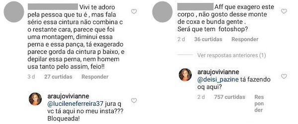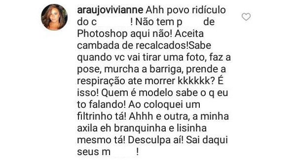 As fotos de Viviane Araújo nas redes sociais costumam fazer sucesso nas redes sociais. Porém, desta vez, a dançarina fez questão de dar uma resposta para os seguidores que alegaram que ela estava abusando de softwares de edição. “Ah povo ridículo do c*ralho! Não tem p*rra de Photoshop aqui não! Aceita, cambada de recalcados! Sabe quando você vai tirar uma foto, faz a pose, murcha a barriga, prende a respiração até morrer kkkkk? É isso! Quem é modelo sabe o que eu estou falando! Aí coloquei um filtrinho, tá?! Desculpa aí! Sai daqui, deus m*rdas!”, teria respondido a atriz conforme informações do UOL. Além disso, ela teria bloqueado outra internauta. Veja: