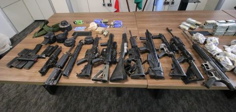 No total foram encontrados 13 fuzis calibres 7,62 e 5,56, uma submetralhadora calibre 9mm, duas espingardas calibre 12, duas pistolas calibre 9mm, uma granada, carregadores, munições e tabletes de crack.